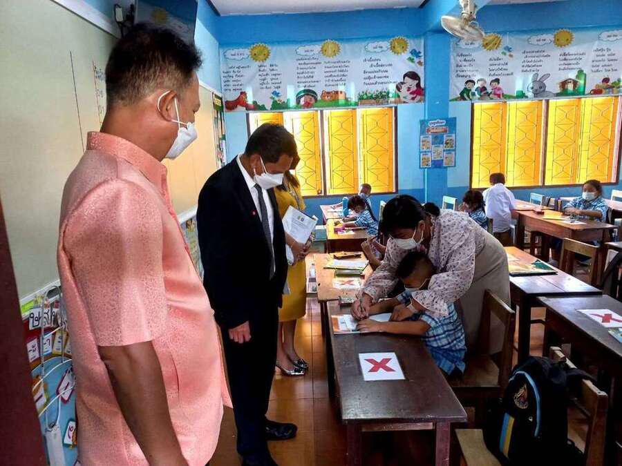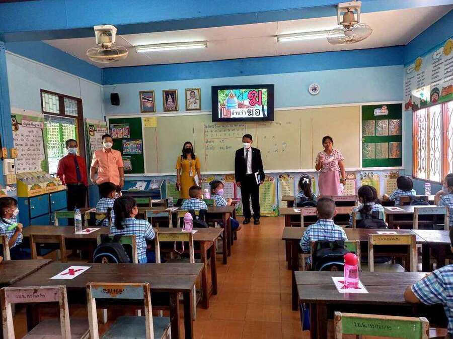 (17 พฤษภาคม 2565) ดร.กนิษฐา ทองเลิศ ผู้อำนวยการสำนักงานเขตพื้นที่การศึกษาประถมศึกษาปทุมธานี เขต 1 มอบหมายให้ ดร.วิเชียร วาพัดไทย รองผู้อำนวยการสำนักงานเขตพื้นที่การศึกษาประถมศึกษาปทุมธานี เขต 1 ลงพื้นที่เยี่ยมให้กำลังใจผู้บริหารสถานศึกษา คณะครู และนักเรียน ในการเปิดภาคเรียน ปีการศึกษา 2565 เป็นวันแรกในรูปแบบออนไซต์ (On-Stie) 100% พร้อมกับให้สถานศึกษายึดถือปฏิบัติบนหลักการพื้นฐานคือ 3T 1V ?ตัดความเสี่ยง เพิ่มภูมิคุ้มกัน? ซึ่งประกอบด้วย T : Thai Stop Covid Plus (TSC+) สถานศึกษาต้องประเมินตนเองเตรียมพร้อมก่อนเปิดเรียน T : Thai Save Thai (TST) นักเรียน ครู และบุคลากรทางการศึกษามีการประเมินความเสี่ยงตนเองเป็นประจำ T : Test ตรวจคัดกรอง เฝ้าระวังอย่างเหมาะสม เช่น ตรวจ ATK เมื่อมีความเสี่ยงหรือมีอาการ และ V : Vaccine ครู บุคลากร ผู้ปกครอง และนักเรียน ได้รับวัคซีนโควิด-19 ตามเกณฑ์พร้อมเน้นย้ำการปฏิบัติตามข้อกำหนด 6 มาตรการหลัก (DMHT-RC) 6 มาตรการเสริม (SSET-CQ) และแนวทาง 7 มาตรการเข้ม อย่างเคร่งครัด อาทิ เว้นระยะห่าง สวมหน้ากาก 100 % ล้างมือ ตรวจเชื้อด้วย ATK เมื่อมีอาการหรือเสี่ยง รวมถึงการดำเนินการตามแผนเผชิญเหตุ เมื่อพบผู้ติดเชื้อหรือผู้สัมผัสเสี่ยงสูง โดยเน้นย้ำไม่มีการปิดชั้นเรียนหรือโรงเรียน เป้าประสงค์เพื่อให้นักเรียนได้รับการเรียนรู้อย่างเต็มที่ที่โรงเรียน ณ โรงเรียนวัดดาวเรือง โรงเรียนวัดเปรมประชากร โรงเรียนวัดบางพูน และโรงเรียนวัดโบสถ์(บวรธรรมกิจวิทยา อำเภอเมืองปทุมธานี จังหวัดปทุมธานี S:0
